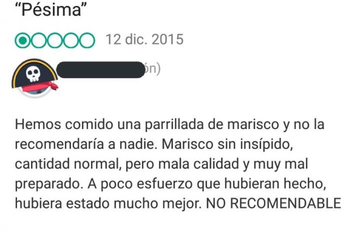 El usuario puntúa al local con un punto sobre cinco y asegura que no recomendaría a nadie la parrillada de marisco que comió. “Marisco insípido, cantidad normal, pero muy mala calidad y muy mal preparado”, se queja antes de apuntar que “a poco esfuerzo que hubieran hecho hubiera estado mucho mejor”. “No recomendable”, zanja.