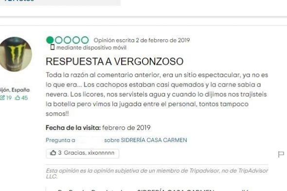 Pese a ese contexto, un cliente quiso dejar consctancia de que, en su opinión, la sidrería “era un sitio espectacular”, pero que “ya no es lo que era”: “Los cachopos estaban casi quemados y la carne sabia a nevera. Los licores, nos servisteis agua y cuando lo dijimos nos trajisteis la botella pero vimos la jugada entre el personal, tontos tampoco somos!!”.