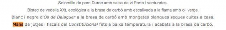 El plato de "guardia civil andaluz a la brasa" (que en realidad es de sardina a la brasa) consta en los desayunos de cuchillo y tenedor, a un precio de nueve euros, mientras que el de "manos de jueces y fiscales del Constitucional hechos a baja temperatura y acabados a la brasa de carbón" (a la sazón, pies de cerdo) es uno plato del menú diario de este miércoles, disponible por 14,50 euros.