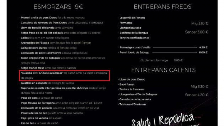 El restaurante Nova Font Blanca de localidad de Balaguer (Lleida) se ha convertido en tendencia en las redes sociales en las últimas horas después de que haya trascendido que en su carta ofrece platos con connotaciones independentistas, como "guardia civil andaluz a la brasa" o "manos de jueces y fiscales del Constitucional". Todo, en un menú que que desea a sus clientes "Salud y república, y que Dios nuestro señor os guarde", cuyas capturas puedes ver a continuación y que se encuentra colgado en la web del negocio.