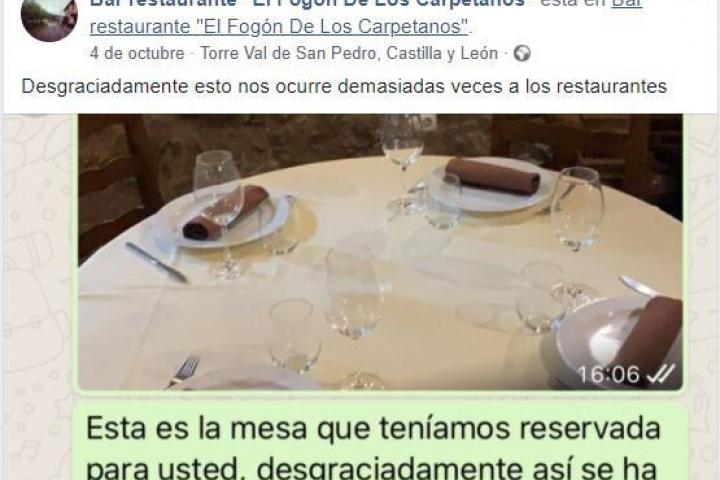 Por eso, no es de extrañar el indignado mensaje que enviaron los propietarios de El Fogón de los Carpetanos, un restaurante del municipio segoviano de Torre Val de San Pedro, a un cliente que había reservado mesa para cuatro y que finalmente no se presentó y tampoco avisó de su ausencia.