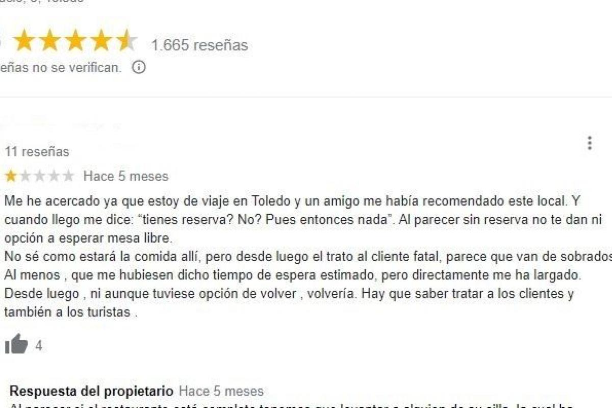 “Me he acercado ya que estoy de viaje en Toledo y un amigo me había recomendado este local. Y cuando llego me dice: ’¿Tienes reserva? ¿No? Pues entonces nada”, empieza describiendo el cliente.