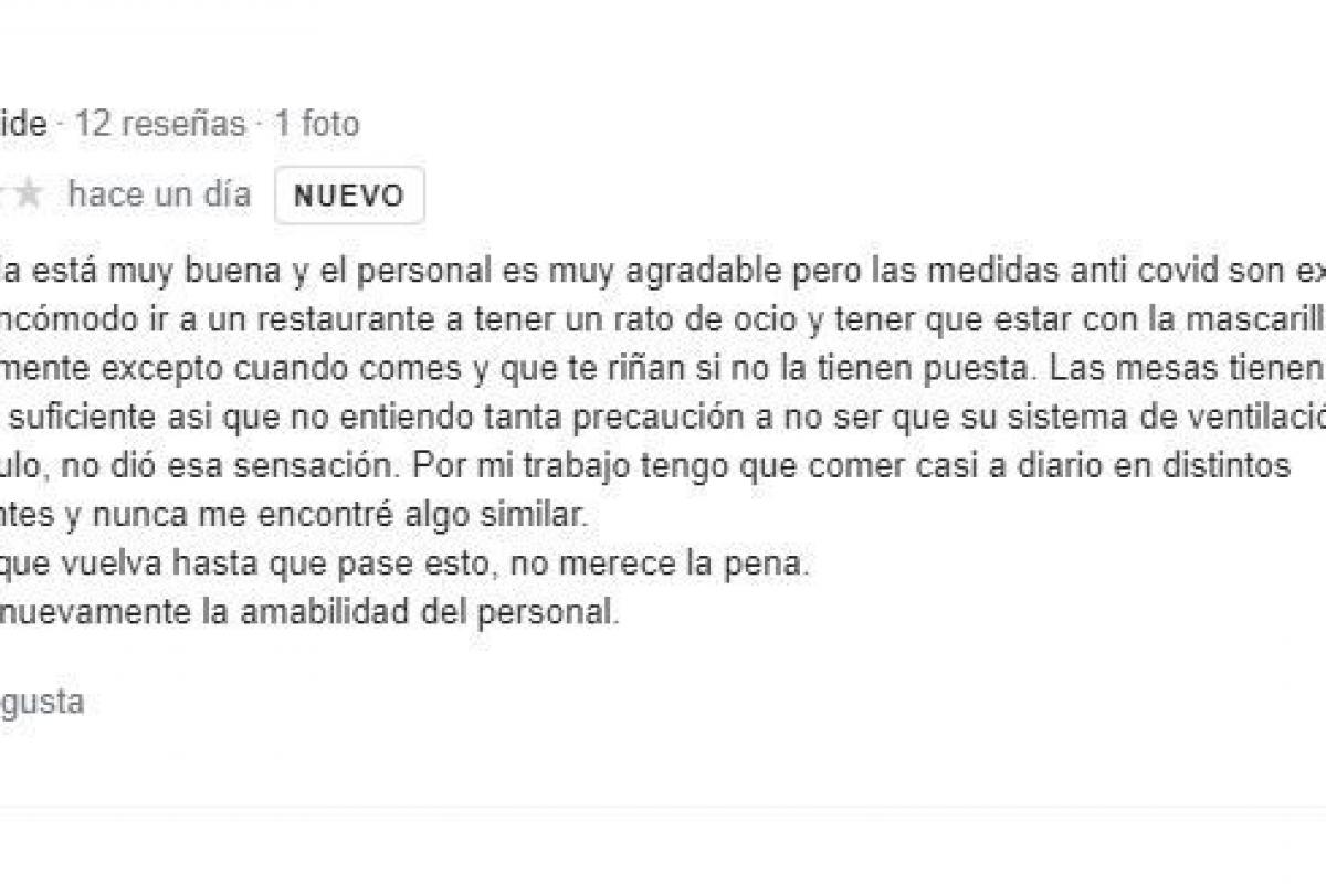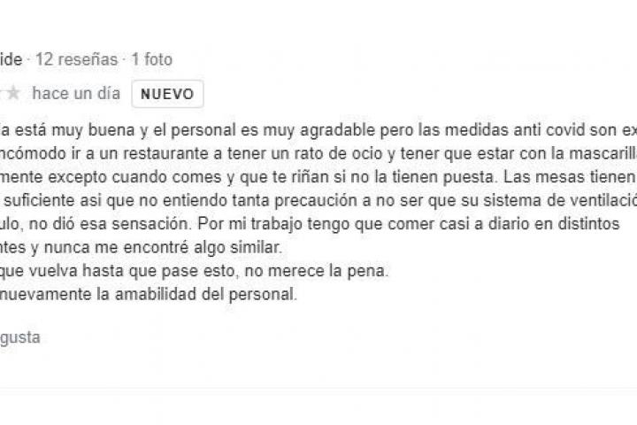 De hecho, la comensal dice en su crítica que “la comida está muy buena y el personal es muy agradable” pero mariza que “las medidas anti covid son exageradas”.