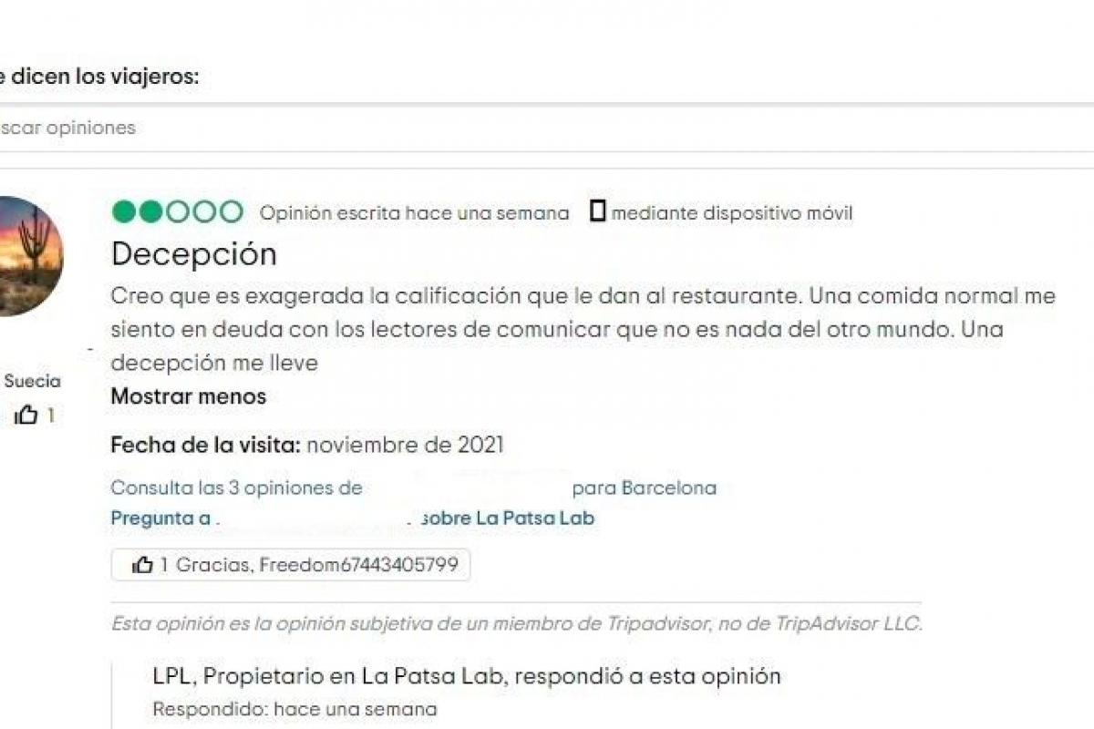 Para entender la crítica hay que conocer el contexto: el restaurante en cuestión es La Patsa Lab, que tiene la tercera mejor puntuación en TripAdvisor de los más de 8.750 negocios de hostelería en la capital catalana.
