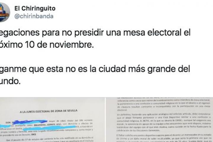 A falta de menos de dos semanas de un nuevo domingo electoral, se ha viralizado la excusa que ha dado un ciudadano socio y aficionado al Betis, ya que se ese domingo a las 21 horas el club bético juega el derbi contra el Sevilla.