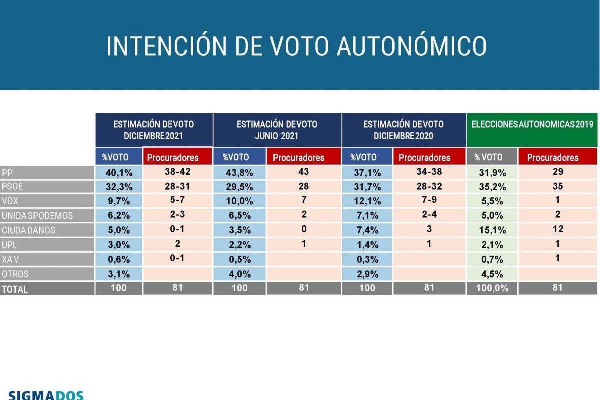 El PSOE sería la segunda fuerza en la comunidad al perder apoyos y pasar del 35,2% de los votos cosechados en 2019 al 32,3%, por lo que obtendría entre 28 y 31 procuradores, frente a los 35 actuales, mientras que Vox se consolidaría como tercera fuerza con un 9,7% de los apoyos y entre 5 y 7 procuradores, frente al 5,5% cosechado en la última cita electoral.