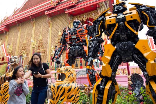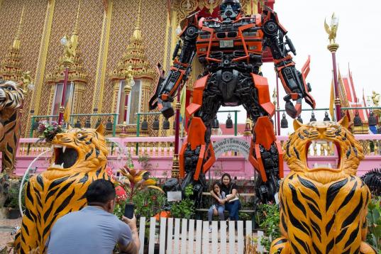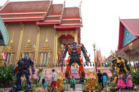Un templo budista coloca dos inmensos Transformers en su puerta para atraer visitantes