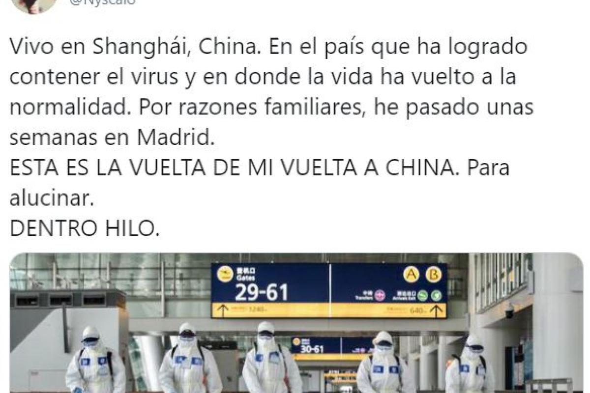 El tuitero Nyscalo, residente en la ciudad china de Shangái, ha hecho un hilo explicando su vuelta a la ciudad asiática tras pasar unas semanas en Madrid. Su relato se ha hecho viral y en cuestión de horas ha superado los 45.000 me gusta y los 35.000 compartidos.