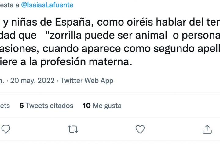 “Niños y niñas de España, como oiréis hablar del tema, recordad que “zorrilla puede ser animal o persona” y en ocasiones, cuando aparece como segundo apellido, se refiere a la profesión materna”, le dijo a Lafuente un usuario de Twitter usando la misma fórmula que él en su tuit sobre el rey emérito.