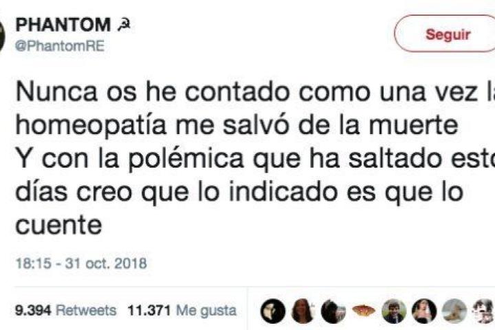"Nunca os he contado cómo una vez la homeopatía me salvó de la muerte", comenzó a tuitear este usuario, que, por supuesto, creó consternación con este primer mensaje. "Con la polémica que ha saltado estos días, creo que lo indicado es que lo cuente", agregó.