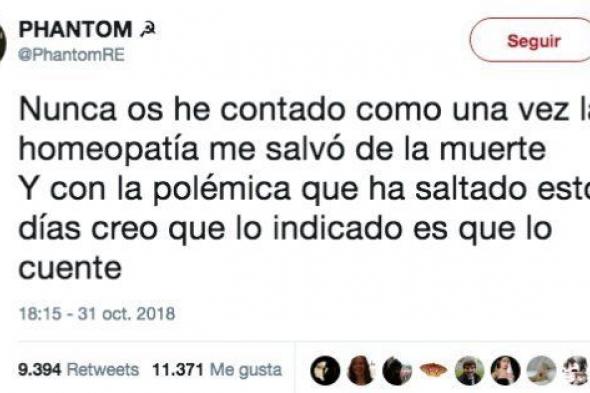"Nunca os he contado cómo una vez la homeopatía me salvó de la muerte", comenzó a tuitear este usuario, que, por supuesto, creó consternación con este primer mensaje. "Con la polémica que ha saltado estos días, creo que lo indicado es que lo cuente", agregó.
