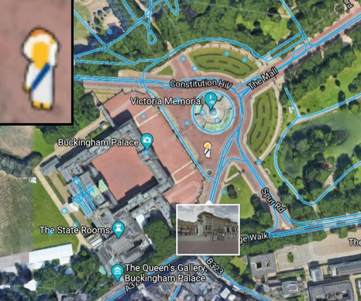 El hombre se percató de que, al sobrevolar la zona con la aplicación, el tradicional muñeco que da acceso a la opción Google Street View se transforma para convertirse en una especie de reina.