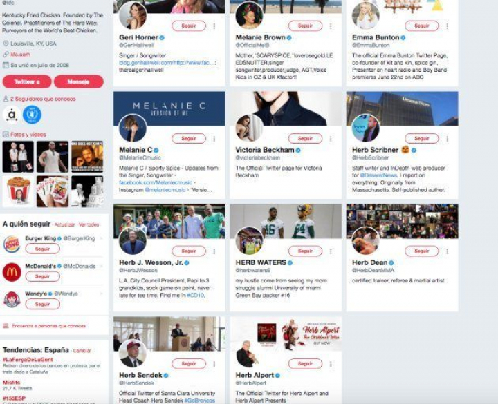 De entrada, KFC sigue a las cinco Spice Girls: Geri Halliwell, Mel B, Emma Bunton, Mel C y Victoria Beckham. Y, luego, a seis personas que se llaman Herb, entre ellos una estrella de la NFL y un político.