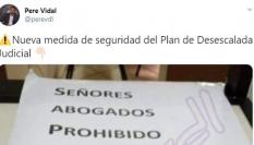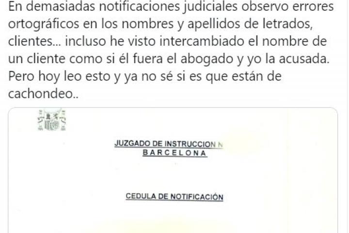 “En demasiadas notificaciones judiciales observo errores ortográficos en los nombres y apellidos de letrados, clientes... incluso he visto intercambiado el nombre de un cliente como si él fuera el abogado y yo la acusada. Pero hoy leo esto y ya no sé si es que están de cachondeo...”, ha escrito la propia Velles en su cuenta de Twitter adjuntando una foto de la nota judicial.