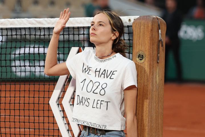 Una ambientalista irrumpe en Roland Garros y se encadena a la red con un claro mensaje: "Nos quedan 1.028 días"