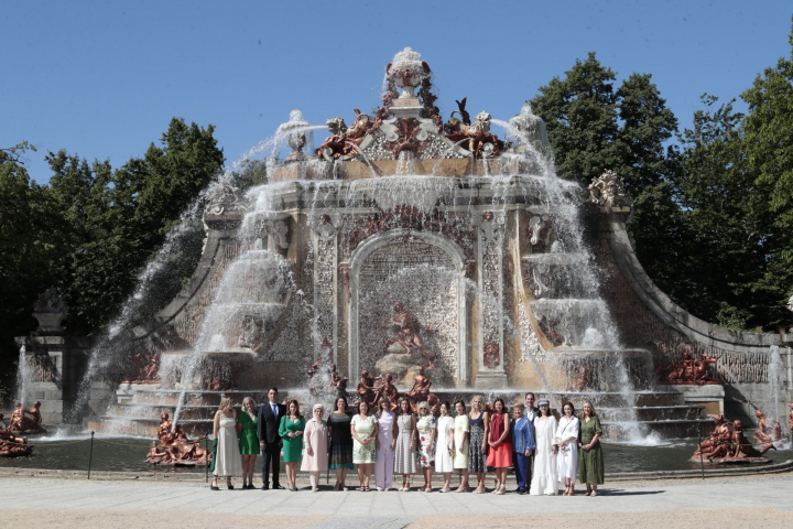 En el caso de las parejas y acompañantes de los líderes que se han desplazado hasta la capital la agenda ‘paralela’ de la cumbre ha comenzado con una visita al Palacio Real de la Granja de San Ildefonso en Segovia. La reina Letizia ha sido la encargada de recibir al grupo, que ha llegado a Segovia capitaneado por Begoña Gómez en AVE.