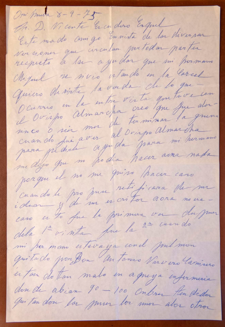 En la misiva, fundamental para conocer los últimos momentos de la vida del poeta de Orihuela, su hermano Vicente cuenta a un amigo las distintas gestiones que realizó durante la estancia de Miguel Hernández en la cárcel para que fuera atendido, dado su precario estado de salud.