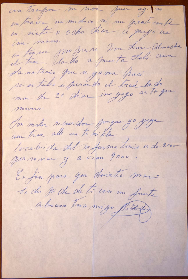 El hermano explica en la carta las condiciones inhumanas en las que se encontraba el poeta al igual que otros reclusos: “Cuando mi hermano estaba ya con el pulmón quitado por don Antonio Barbero, estando tan malo en aquella enfermería donde había noventa o cien hombres tendidos quitándose las puses los unos a los otros con trapos sucios, pues allí no entraba un médico o un practicante en siete u ocho días, aquello era inhumano”.