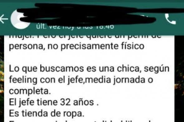 "Lo que buscamos es una chica, según feeling con el jefe, media jornada o completa". Así comienza una de las ofertas más repugnantes que se recuerdan, que se ha vuelto viral después de que una joven sevillana que la recibió en WhatsApp la compartiese en redes sociales.