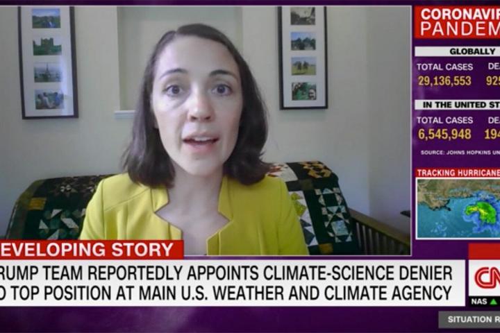 La científica estadounidense y directora del Centro para la Ciencia y la Democracia de la USC (EEUU) Gretchen Goldman, ha compartido una imagen que se ha vuelto viral en solo minutos. En ella mostraba cómo había sido su entrevista de este martes en la CNN sobre la decisión de Donald Trump de poner al frente a un negacionista del cambio climático al mando de la Administración Nacional Oceánica y Atmosférica, pero desde dos perspectivas distintas.