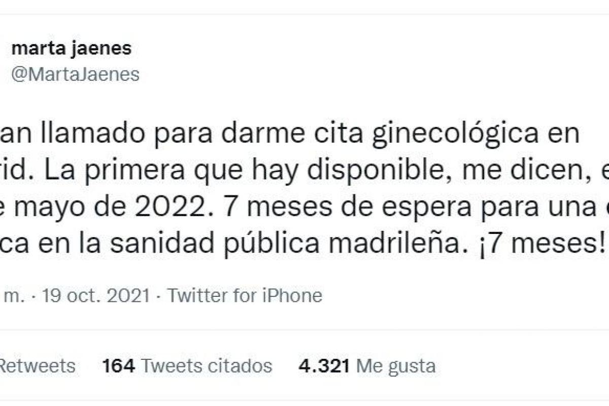 Una cita de ginecología no había dado tanto de qué hablar como la que ha recibido la periodista Marta Jaenes. Pero no por el hecho de la cita en sí, sino por la fecha que le han dado en la sanidad pública madrileña, y que es todo lo contrario a lo que dijo la presidenta madrileña Isabel Díaz Ayuso hace unos días en la Asamblea de la comunidad cuando alardeaba de su gestión y de tener la sanidad que “toda España desearía cuidar”.
