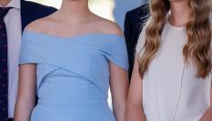 Ya por la tarde, la primogénita de Felipe y Letizia ha llegado a la ceremonia de entrega de los Princesa de Girona con un vestido azul cielo de Miphai con escote cruzado y falda de vuelo. Ha completado el conjunto con unos tacones en tono nude y un moño de bailarina, a imagen y semejanza de su madre.