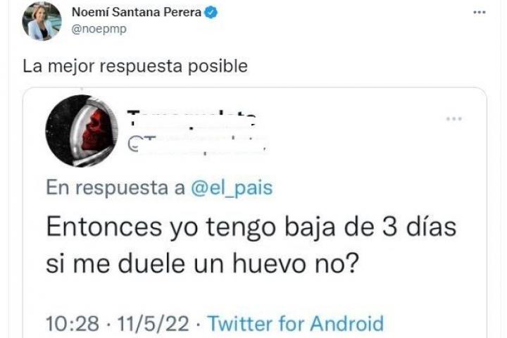 Noemí Santana, consejera de Derechos Sociales, Igualdad, Diversidad y Juventud del Gobierno de Canarias, ha compartido la respuesta que una usuaria ha dado a un tuitero que lanzó un mensaje irónico sobre la noticia de que el borrador de la futura ley para la protección de los derechos sexuales y reproductivos recoge bajas de tres días para las mujeres que tengan reglas dolorosas.