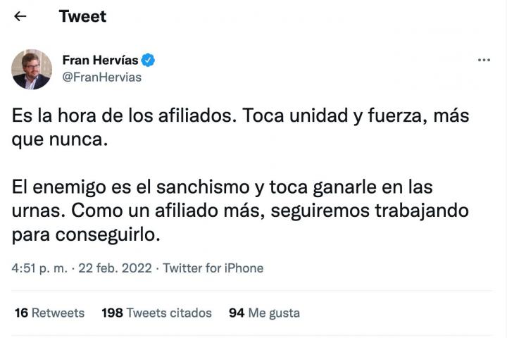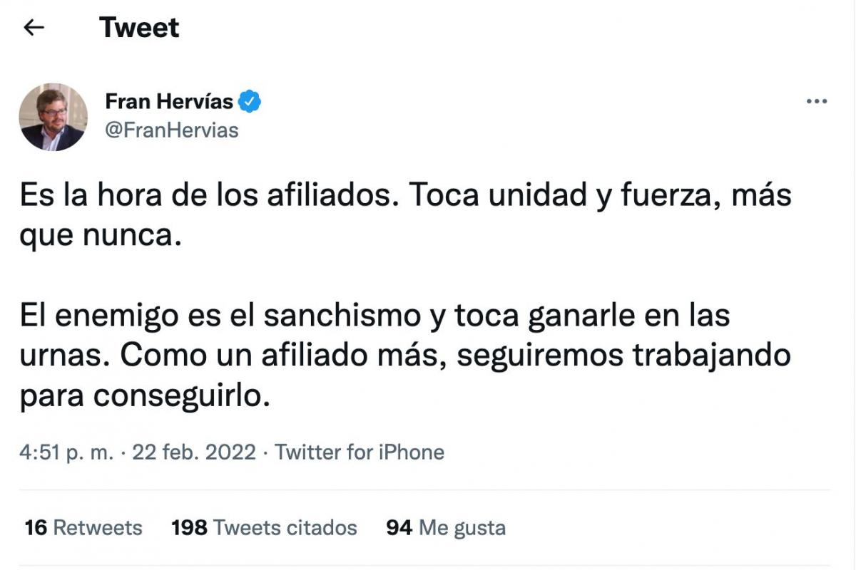 Ahora, cuando los dos dirigentes del PP están en su peor momento dentro del partido, Hervías ha escrito en Twitter: “Es la hora de los afiliados. Toca unidad y fuerza, más que nunca. El enemigo es el sanchismo y toca ganarle en las urnas. Como un afiliado más, seguiremos trabajando para conseguirlo”.