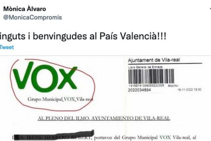 La diputada de Compromis en las Cortes de Valencia Mònica Àlvaro ha compartido en su perfil de Twitter la carta enviada por el grupo municipal de Vox en Villarreal (Castellón) y ha querido destacar un detalle en rojo.