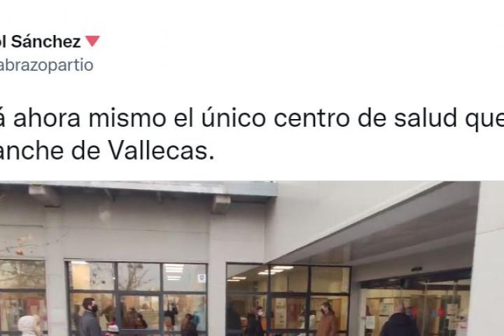 La publicación, compartida a primera hora de este lunes, muestra el estado en el que se encontraba un centro de salud de la zona de Ensanche de Vallecas. Las colas de gente van desde la puerta del ambulatorio hasta las vallas.