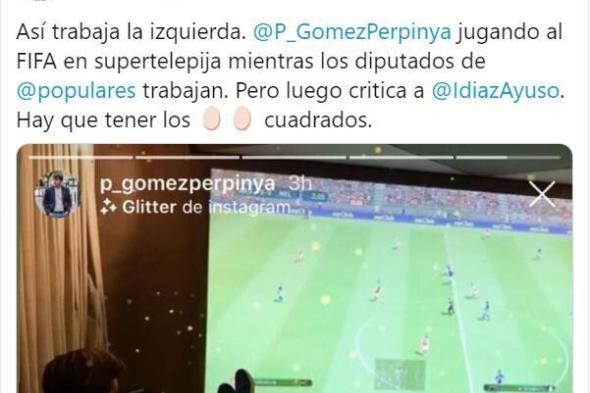 “Así trabaja la izquierda. Pablo Gómez Perpinyà jugando al FIFA en supertelepija mientras los diputados del PP trabajan. Pero luego critica a Díaz Ayuso. Hay que tener los huevos cuadrados”, ha escrito la diputada del PP.