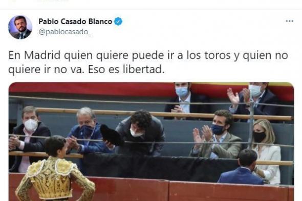 Pablo Casado ha generado una importante controversia en Twitter con una publicación dedicada a los toros y a la libertad. El presidente del Partido Popular escribió un mensaje en la red social del pájaro azul después de acudir a una corrida de toros en Madrid con motivo de la fiesta de San Isidro.