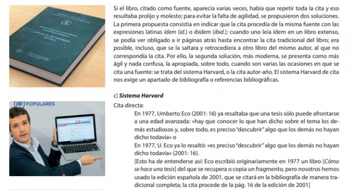 El editor describe la razón por la que salen algunos de los políticos del PP en el libro. Empieza haciéndolo con Pablo Casado, el actual líder del Partido Popular: “Aparece cuando se habla de las citas y de los plagios. A los alumnos se les enseña a cómo citar correctamente en un trabajo académico. Él está debajo de la foto de la tesis de Pedro Sánchez, que ha sido acusado de plagio y de no citar correctamente”.