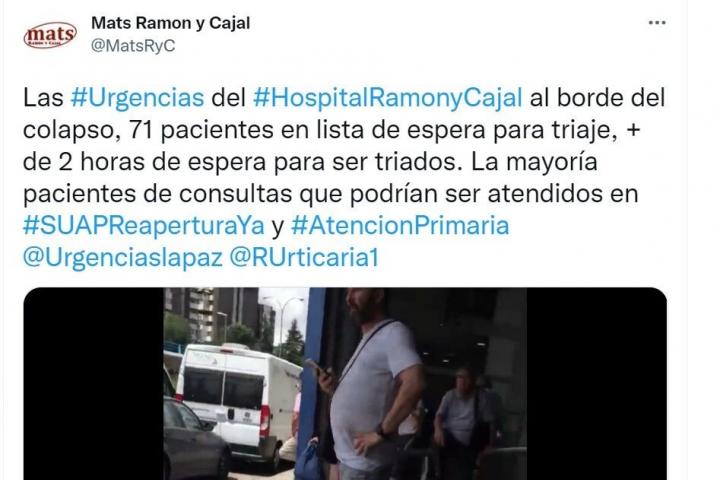 “La mayoría pacientes de consultas que podrían ser atendidos en los Servicio de Urgencias de Atención Primaria (SUAP) y en Atención Primaria”, ha añadido en su tuit la cuenta MATS del Ramón y Cajal.