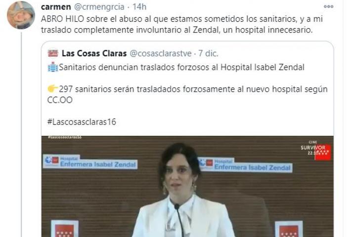“Abro hilo sobre el abuso al que estamos sometidos los sanitarios, y a mi traslado completamente involuntario al Zendal, un hospital innecesario”, ha comenzado.