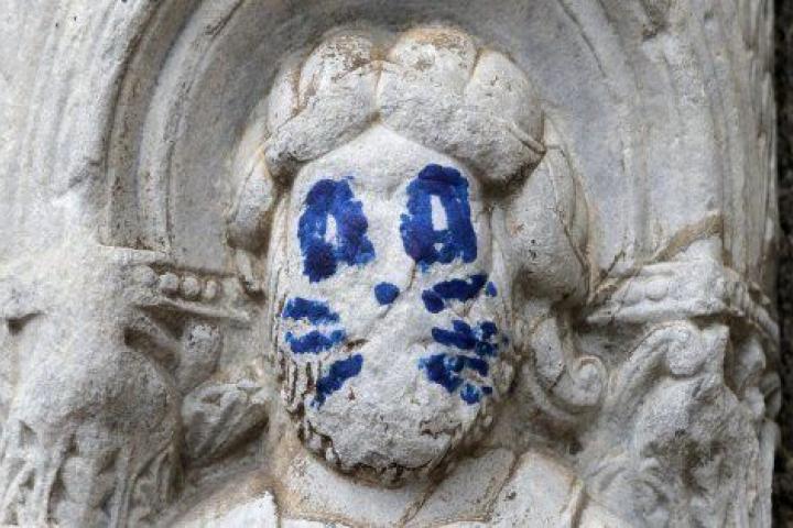 Una escultura situada en la fachada románica de Praterías de la Catedral de Santiago de Compostela ha sufrido un acto vandálico con una pintada.