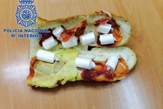 La Policía Nacional detuvo a un joven que ocultaba 100 gramos de cocaína en este bocadillo de jamón y queso.