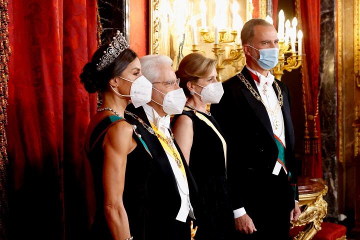 Los reyes, el presidente del Gobierno español, Pedro Sánchez, y otras autoridades han portado la banda verde de la Orden del Mérito de la República de Italia. Doña Letizia ha lucido además la tiara rusa, una de las más preciadas de su joyero.