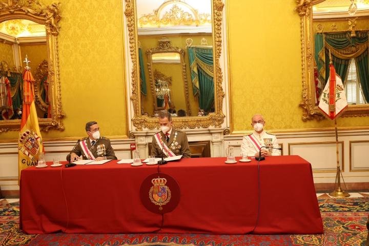 Ya en el interior del Palacio Real, don Felipe ha presidido la reunión de la Orden de San Fernando en su condición de soberano de la institución y ha expedido las cédulas de las nuevas recompensas militares.