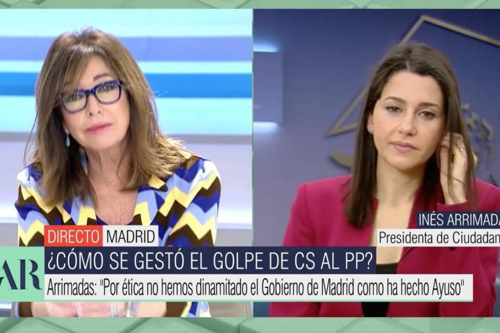 “Señora Arrimadas, yo le entiendo, usted tendría todos los motivos para hacer una moción de censura en Murcia. Lo entiendo y todo pero ahora no puede decir que esto es culpa de Ayuso...”, ha dicho Ana Rosa antes de que Arrimadas interrumpiese.