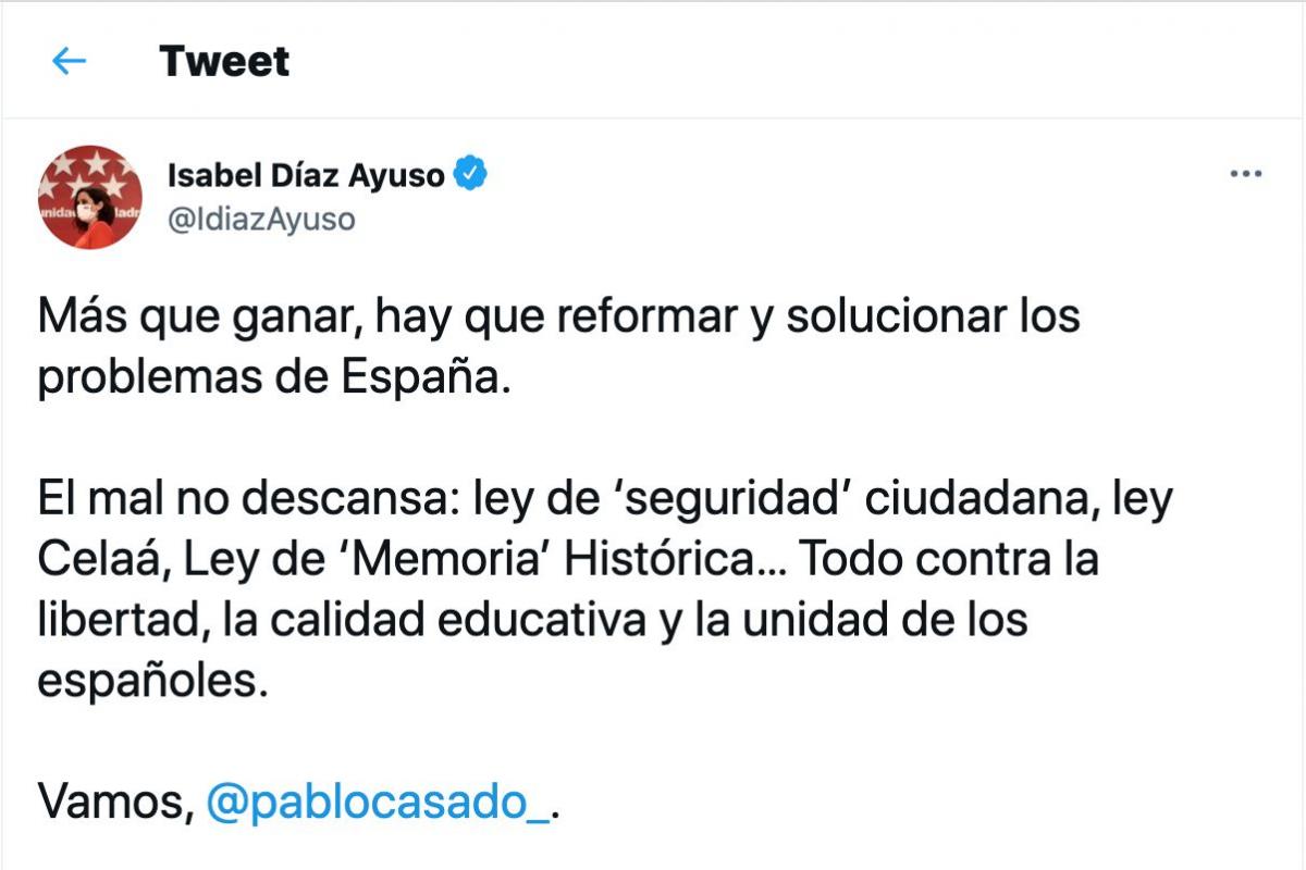 “Más que ganar, hay que reformar y solucionar los problemas de España. El mal no descansa: ley de ‘seguridad’ ciudadana, ley Celaá, Ley de ‘Memoria’ Histórica… Todo contra la libertad, la calidad educativa y la unidad de los españoles”, ha escrito Ayuso.