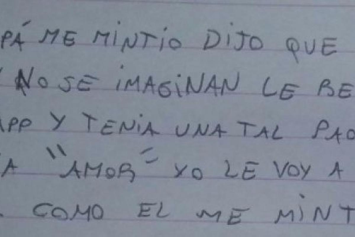 "Mi papá me mintió. Dijo que no tenía novia y no se imaginan. Le revisé el WhatsApp y tenía una tal Paola y ella le decía "amor". Yo le voy a empesar a mentir como él me mintió. Esa chica le decía lindo, amor y cuelo. Si veo a una chica acá dentro les voy a decir mi discurso: "Papá, me mentiste. Pensé que entre nosotros no habían cecretos pero ya veo que hay muchos crecretos. ¿Cuándo pensabas contarme todo esto?" y me voy llorando con Santy a mi pieza y la cierro bien fuerte", dice la primera parte.