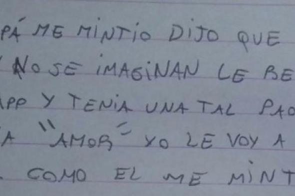 "Mi papá me mintió. Dijo que no tenía novia y no se imaginan. Le revisé el WhatsApp y tenía una tal Paola y ella le decía "amor". Yo le voy a empesar a mentir como él me mintió. Esa chica le decía lindo, amor y cuelo. Si veo a una chica acá dentro les voy a decir mi discurso: "Papá, me mentiste. Pensé que entre nosotros no habían cecretos pero ya veo que hay muchos crecretos. ¿Cuándo pensabas contarme todo esto?" y me voy llorando con Santy a mi pieza y la cierro bien fuerte", dice la primera parte.