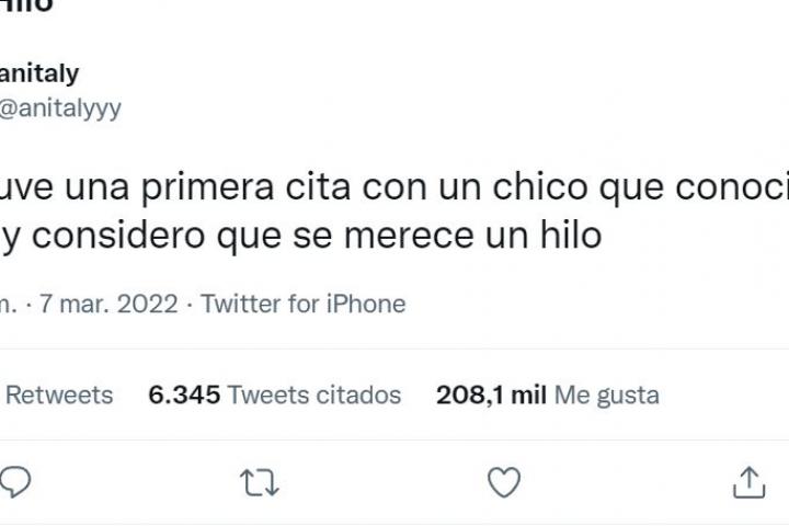 La primera cita de la joven usuaria Anitaly con un chico que conoció de fiesta no es solo la primera de ellos, su encuentro ya pertenece a todo Twitter tras el resumen que ha hecho la protagonista.
