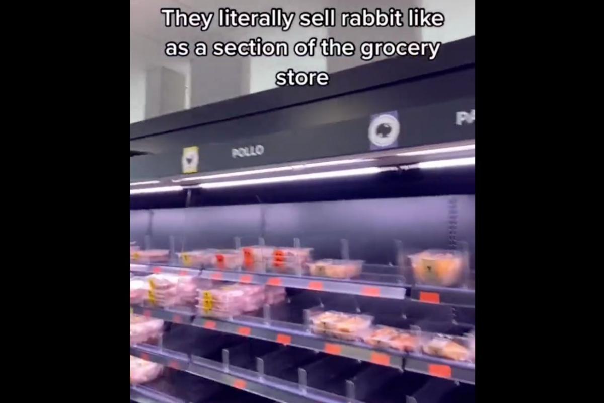 En un vídeo explica que está en un supermercado español y que en la sección de comestibles ha encontrado conejo junto a otros alimentos como el pollo. Además, enfoca una de las cajas con el animal ya troceado en una caja y señala que es algo “completamente normal”.