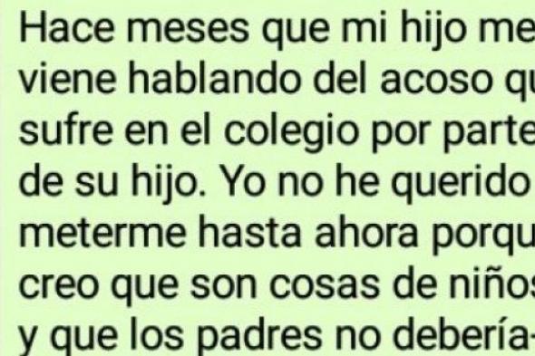 La mujer explica la situación en su mensaje de WhatsApp y subraya que hasta ahora no ha querido intervenir porque considera que son "cosas de niños" y que los padres no deberían sobreprotegerlos. "Pero he educado a mi hijo enseñándole que la violencia física no lleva a ningún lado, que hay que respetar a todas las personas independientemente de su físico, capacidad intelectual o tendencia sexual... y esto hace que mi hijo se vea indefenso ante los ataques del suyo", apunta.