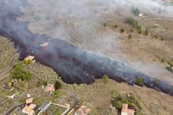 Una colada de lava ya comenzó a afectar desde esta tarde a las viviendas más cercanas, ladera abajo, en el municipio de El Paso, según se puede apreciar en un vídeo aéreo grabado con un dron y facilitado a Efe por su autor.