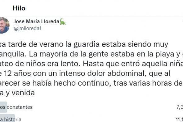 En sus mensajes, escritos en abril de 2020, el médico José María Lloreda relataba el caso que vio en urgencias de una niña de 12 años que se quejaba de un intenso dolor abdominal. Según explica, tras varias investigaciones, análiticas y determinadas pruebas, le detectaron dos bultos.