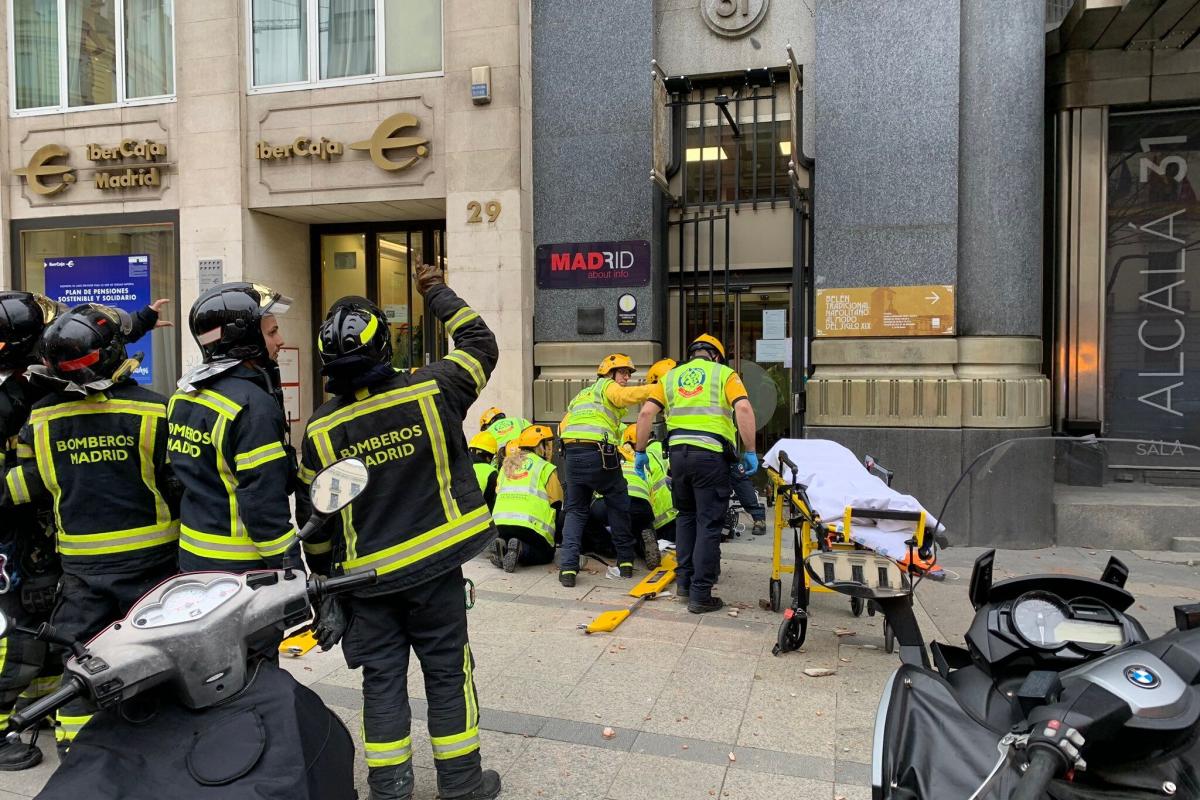 El Samur ha atendido a la mujer que ha recibido el golpe en la cabeza de los cascotes de un edificio situado en el número 31 de la calle Alcalá de Madrid alrededor de las 14.45 horas.