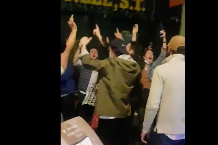 Un grupo de jóvenes, sin mascarilla ni distancia de seguridad, bebe y canta en pleno centro de Madrid.TWITTER: JUANMA SAMUSENKO
